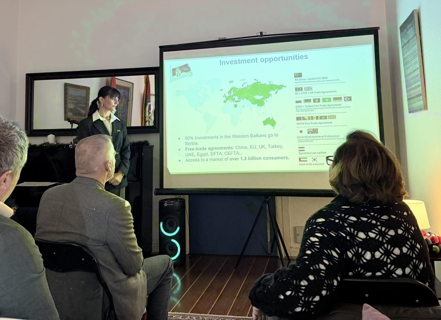 Госте је представио модератор Драган Јованов, док је Ивана Милојевић генерални менаџер Синмартек групе, одржала мултимедијалну презентацију предности које нуди Србија као дестинација за стране инвестиције.