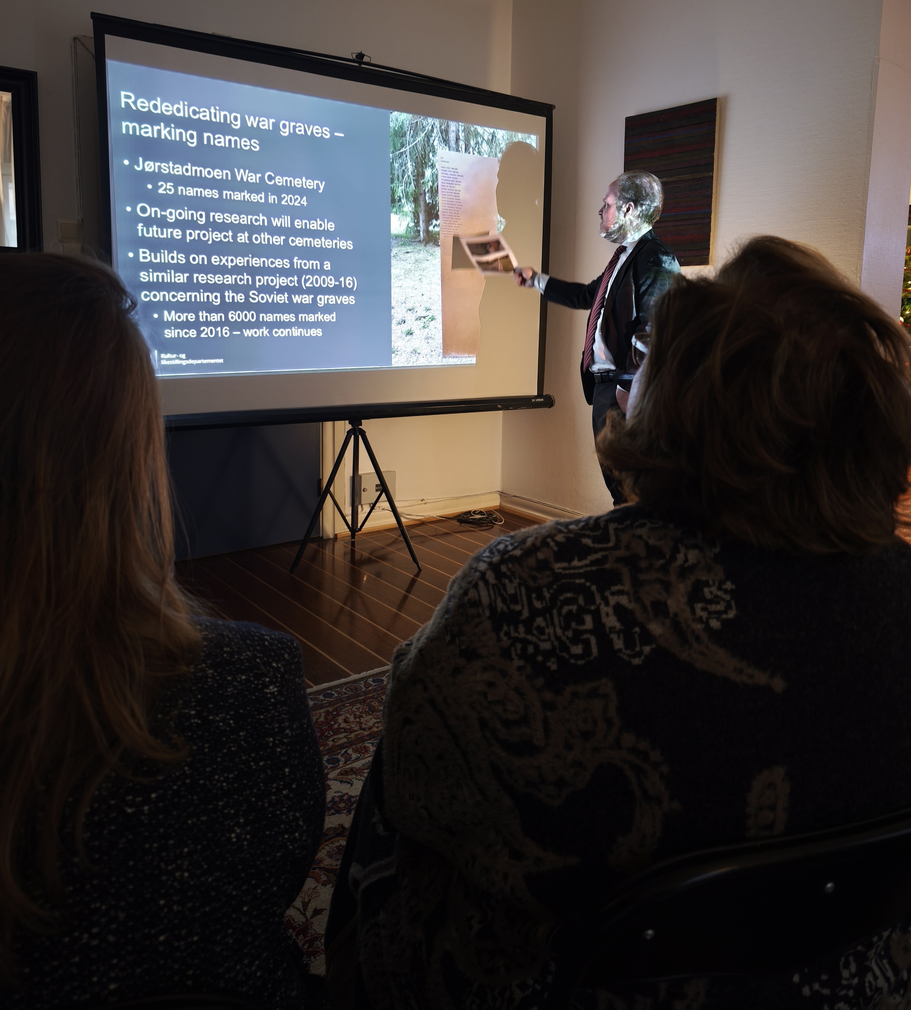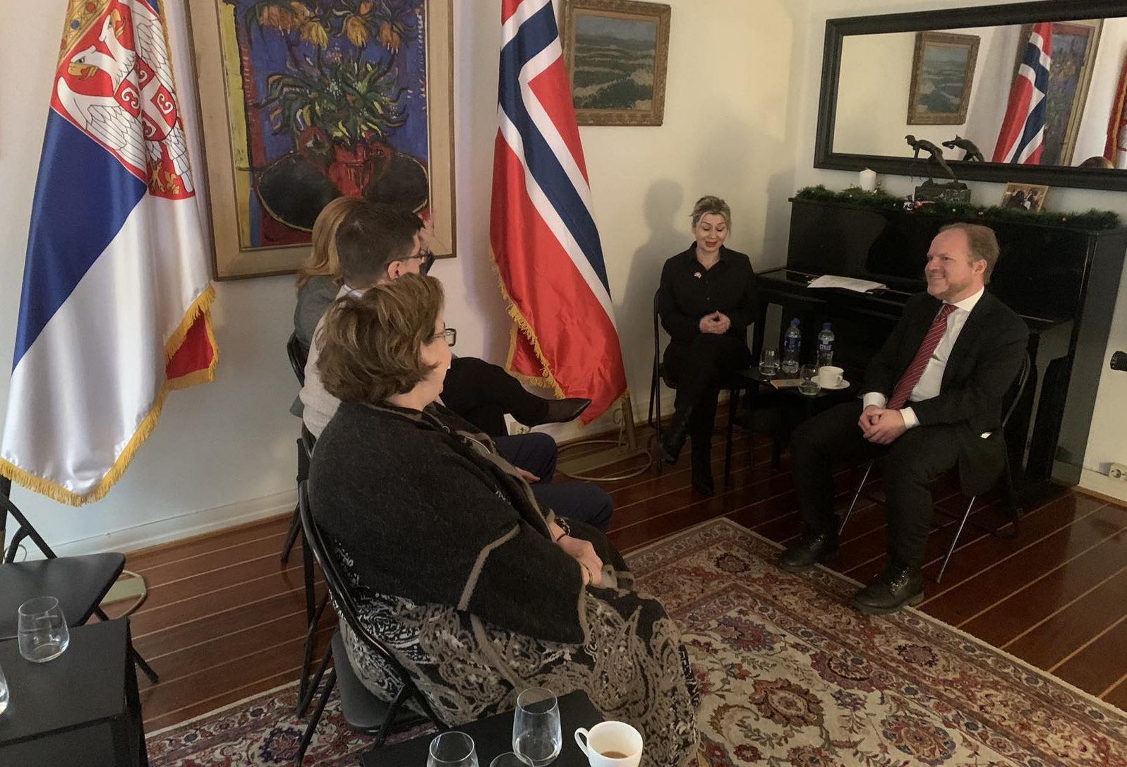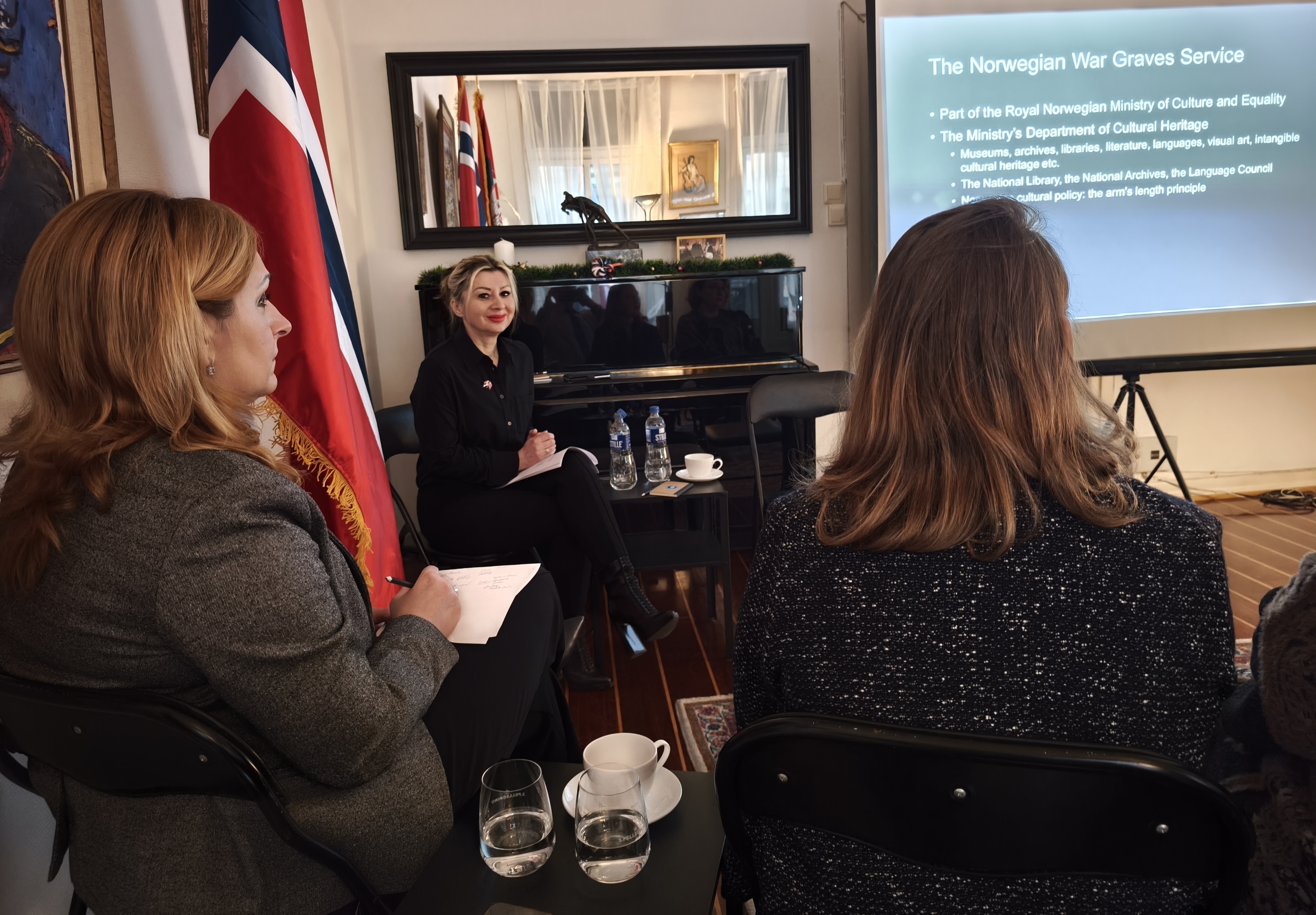 У атмосфери искрене срдачности и пријатељства, Хокон Виње, специјални саветник у Министарству културе Норвешке и директор Службе за бригу о војним гробљима, одржао је презентацију у Амбасади о српским/југословенским меморијалима на норвешкој територији.
